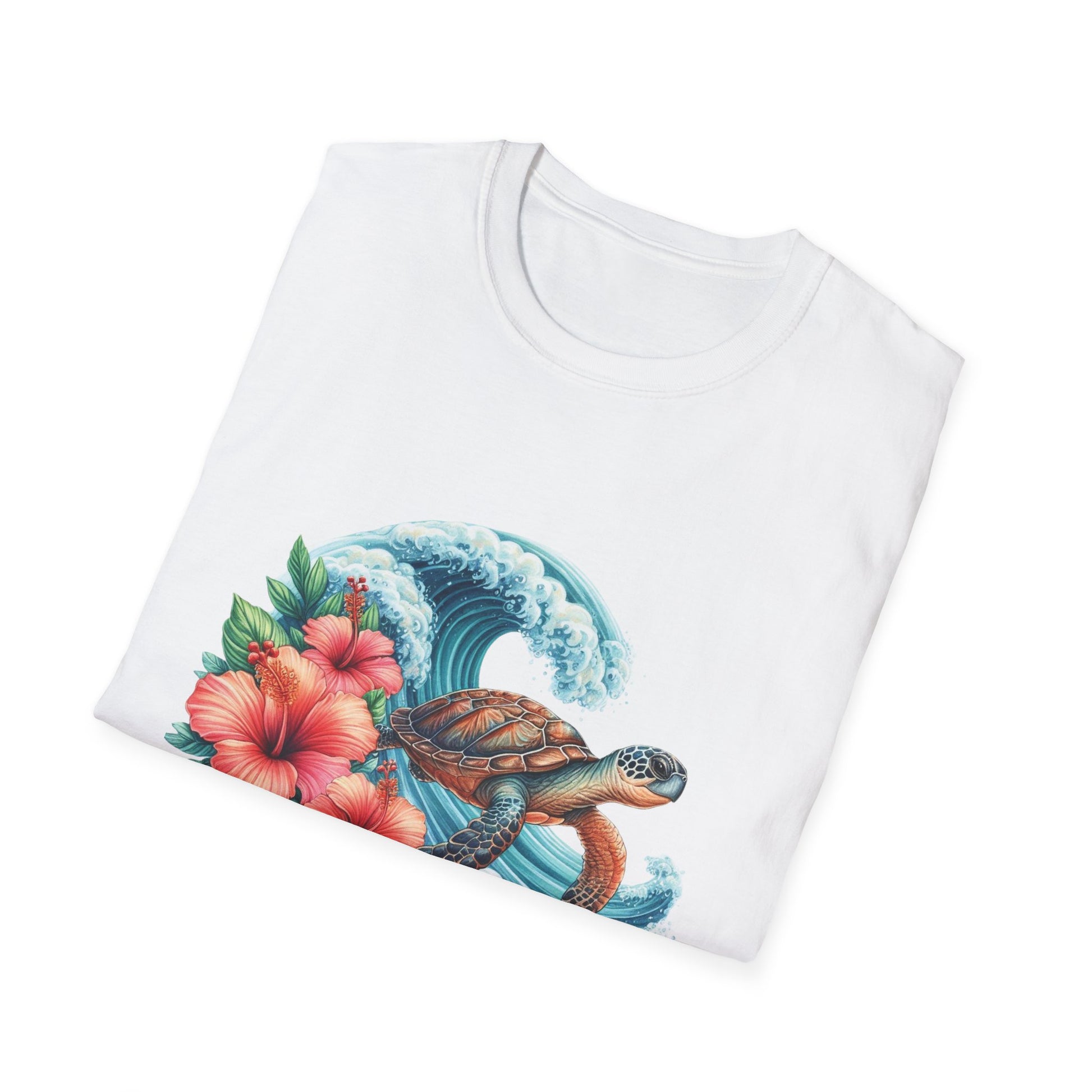 A comfortable unisex t-shirt featuring a design of a sea turtle riding a wave with the saying 'Just go with the flow'. This t-shirt gives off a laid-back, beachy vibe and is perfect for those who love the ocean and surfing. Ideal for casual wear or as a beach cover-up. Suitable for adults and makes a great gift for ocean lovers and surf enthusiasts. Perfect for summer, beach vacations, Earth Day, World Turtle Day, and casual hangouts with friends.